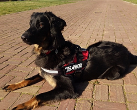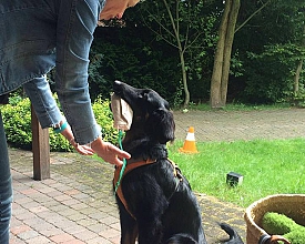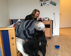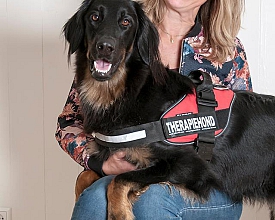 Lotje van Polder Nieuwlande is een Hovawart die de tweejarige opleiding tot therapiehond bij Tilt-vzw in Arendonk (België) heeft gevolgd. Vanuit een duurzame, intensieve, positieve en samenwerkingsgerichte relatie in de driehoek cliënt-hond-professional werken we aan hulpvragen. De hond verhoogt de motivatie en bevordert vooruitgang op het fysieke, sociale en cognitief functioneren. De hond spreekt een universele taal die voor iedereen, ongeacht cognitie en intelligentie, duidelijk is.
